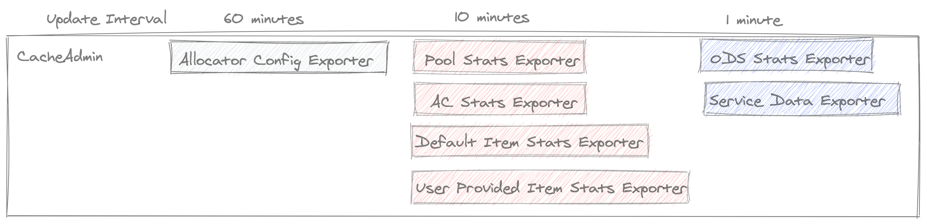CacheAdmin is a component for monitoring the cache health for CacheLib cache. Its purpose is to fetch cache stats from Cache, and then upload them to ODS or Scuba as appropriate. The code is located in fbcode/cachelib/facebook/admin/. CacheAdmin contains the following components. As you can see, we separate them into roughly three groups per their update interval.