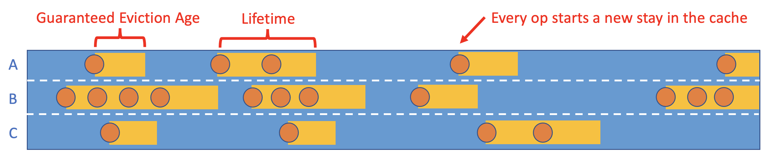 - Define the eviction age T. Note that this is a separate concept from what we call the "lifetime". A "lifetime" represents an objects entire stay in cache, whereas an "eviction age" only measures time relative to the previous operation. Both concepts are annotated below: