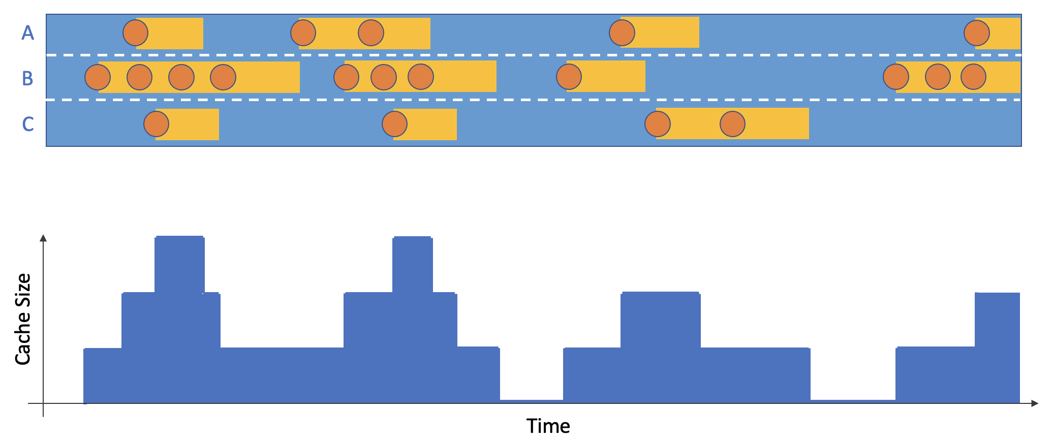Assume every non-delete operation results in the object staying in cache for the duration T or until the TTL eviction time (if applicable). Compute the top-line cache size as a function of time by summing over the individual stints in cache.
