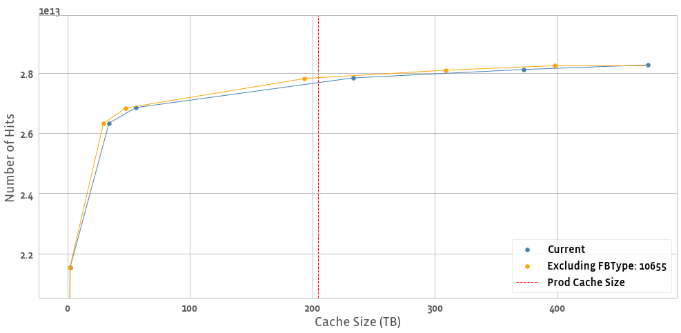 We compute the analysis this way because (1) running a simulated cache at various sizes for every one of our use cases every day is infeasible and (2) we can filter/aggregate results in a well-founded way during post-hoc analysis. See the example below where we've removed an FBType from TAO follower ASH 0 to compute the new hit count for a single day in Feb. 2021